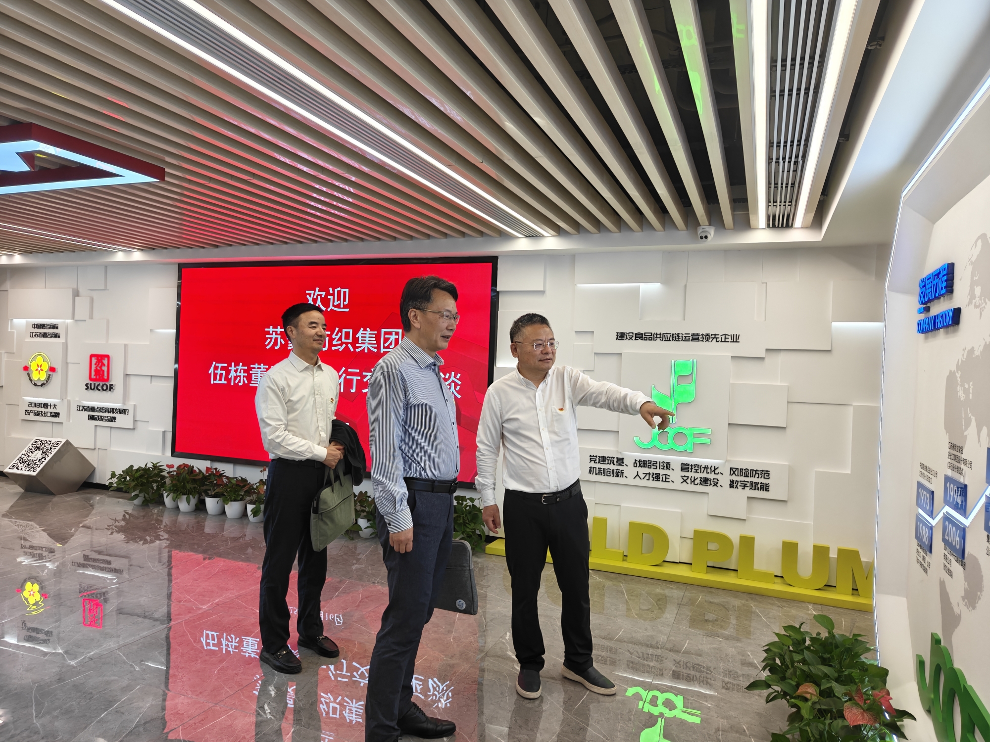 季欣对伍栋一行表示欢迎,并介绍了公司近些年的改革发展情况。他表示,江苏粮油在控股集团的坚强领导下,牢牢把握高质量发展的首要任务,始终坚持专业化、特色化和品牌化的发展方向,聚焦特色农产品出口、食品原料和生鲜冻进口的业务模式,加快培育跨境电商等外贸领域的新质生产力。同为控股集团的子企业,苏豪纺织与江苏粮油在诸多业务领域可以互相学习、借鉴,希望双方不断加强沟通交流,在海外仓资源共享、新零售业态创新等方面深化合作,增强协同,促进双方优势互补、共赢发展。