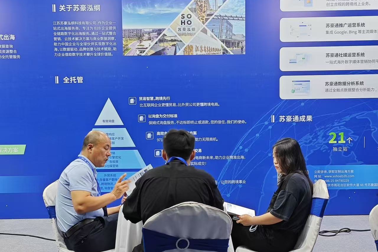 会上,泓纲科技团队推介了自主研发的“苏豪通”系统,该系统提供的服务覆盖了从专业营销型独立站搭建到跨境订单报关的全流程,旨在助力企业高效开展全球贸易业务。系统整合了营销型建站SaaS功能,并结合Google及其他多渠道优化推广、社交媒体运营、大数据分析、贸易及跨境ERP系统开发与维护、跨境支付、物流解决方案以及跨境报关等功能,为传统企业的贸易数字化转型与智能化升级提供支持。