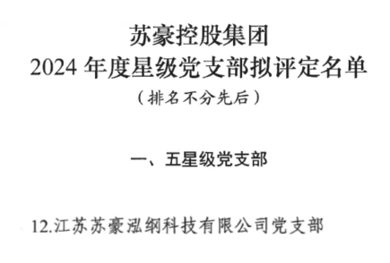 近日,苏豪控股集团公布了2024年度星级党支部评定结果,苏豪纺织党委所属泓纲科技党支部获评“五星级党支部”称号。