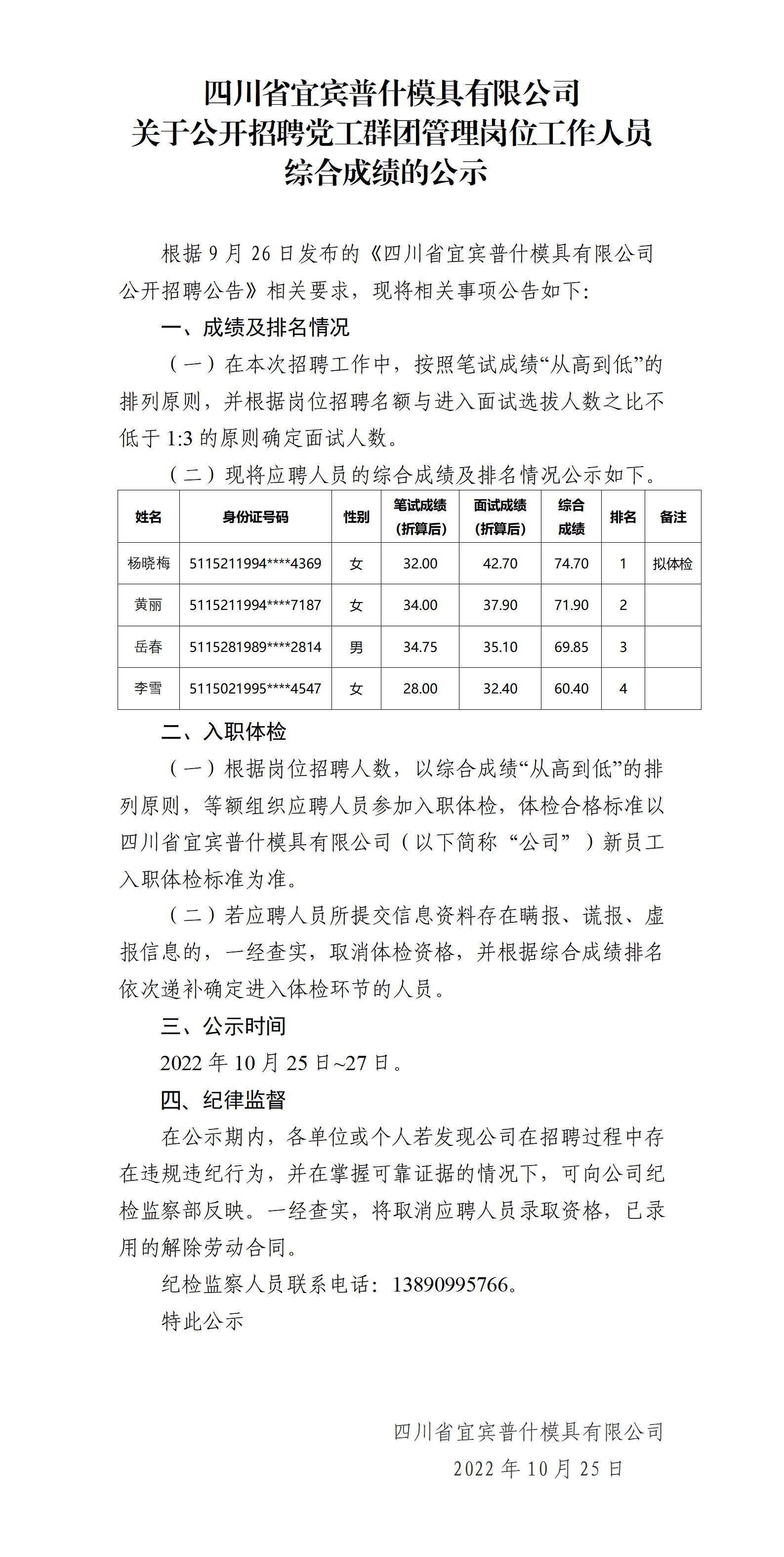 关于公开招聘党工群团管理岗位工作人员综合成绩的公示